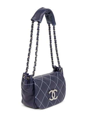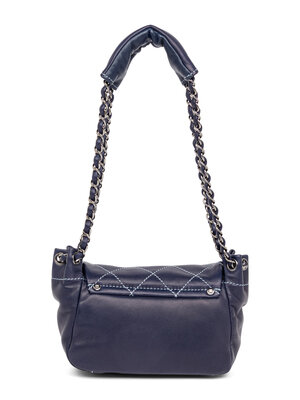Chanel small surpique flap bag in dark navy blue lambskin leather with light blue topstitching and silver-tone hardware. Flap closure with magnetic snap and interwoven leather-metal chain straps with padded leather shoulder component.