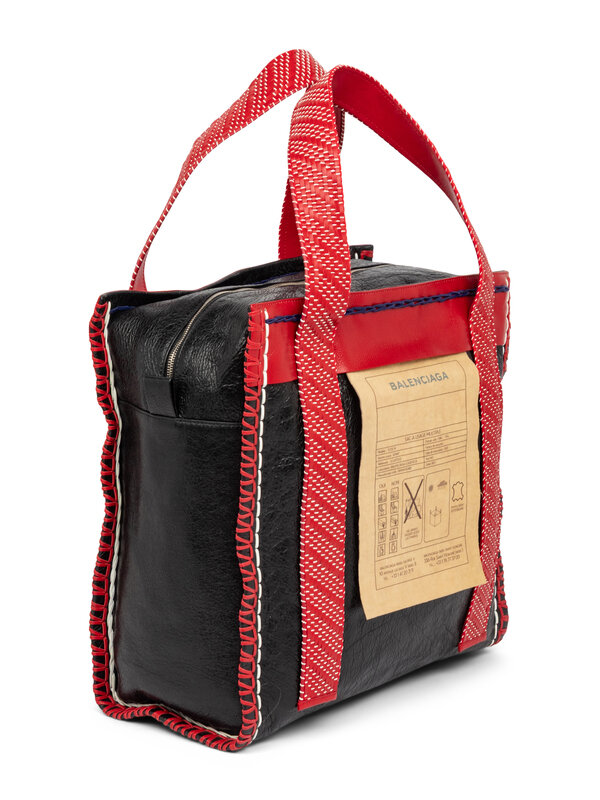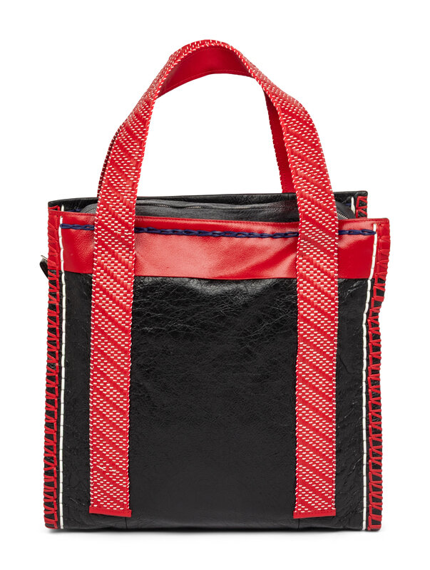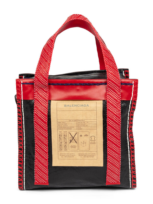 Scaffold Shopper tote in black and red grained calfskin leathers with silver-tone hardware. Double-ended zipper closure and two woven red leather handles. Large printed paper-effect tag at front and whipstitched leather trim throughout.