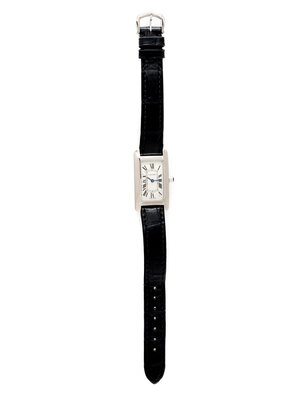 Bracelet/Strap: Black leather signed Cartier with 18K white gold Cartier buckle