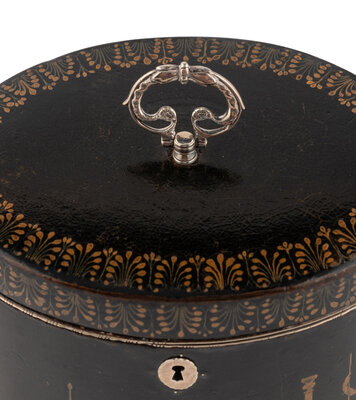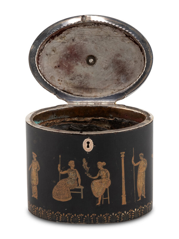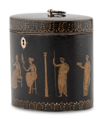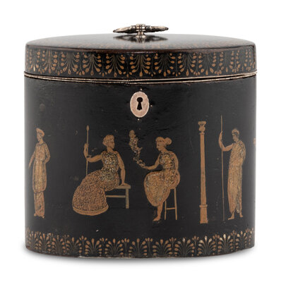An English Ebonized and Pen-Work Decorated Tea Caddy