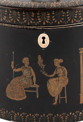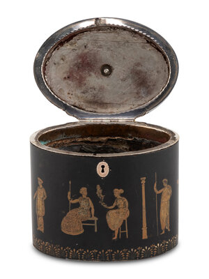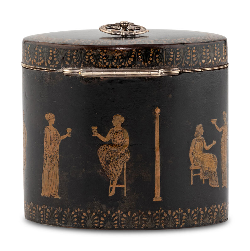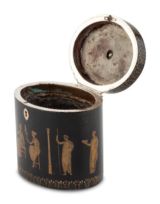 the body decorated with anthemion banding along lid and base, the body decorated with Classical figures.