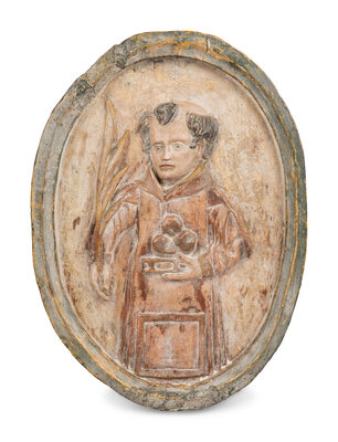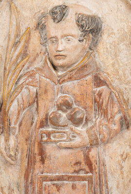 A Continental Carved Wood Plaque Depicting Saint Anthony of Padua