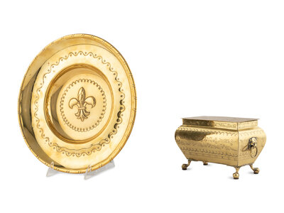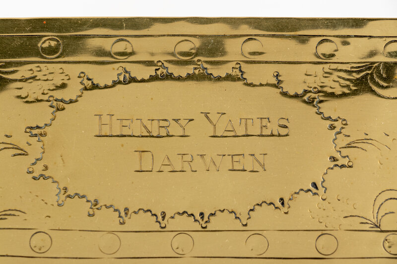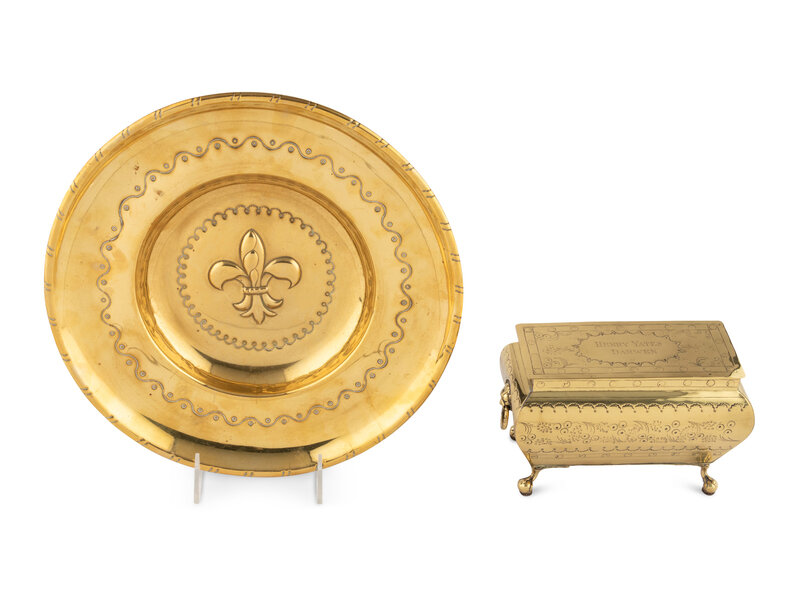 comprising a Dutch tobacco box with an engraved lid reading 'Henry Yates Darwin', together with an alms dish centered with a repoussé fleur-de-lis.