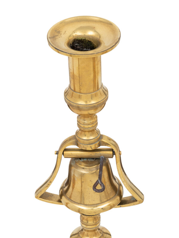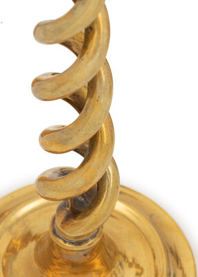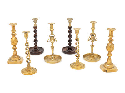comprising a pair of brass-mounted Oak barley-twist, King of Diamonds, double helix and a pair of bell-mounted tavern candlesticks; 8 items total.