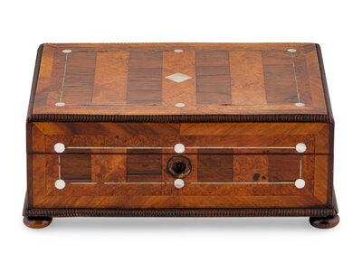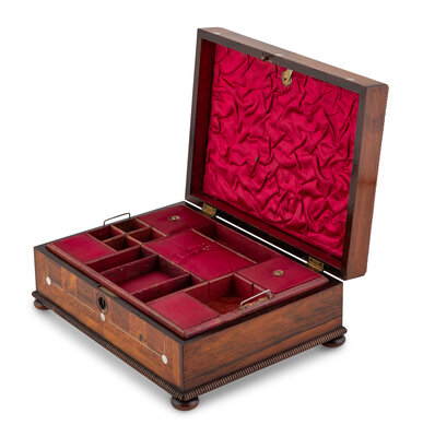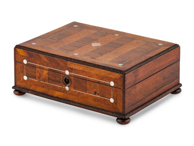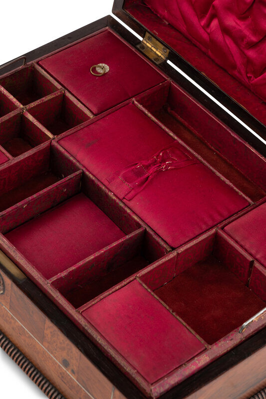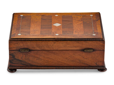 An English Rosewood, Burr Yew and Mother of Pearl Sewing Box