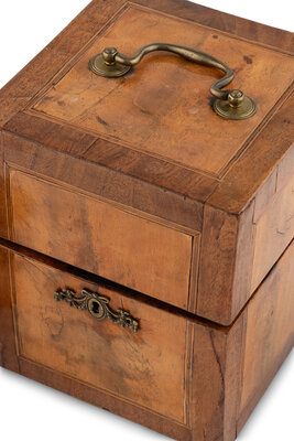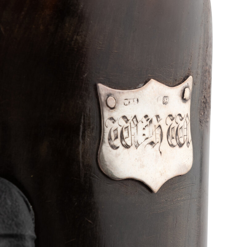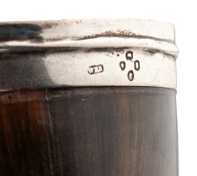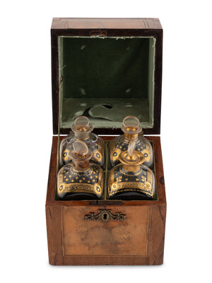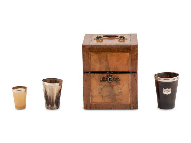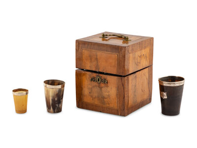 A Walnut and Mahogany Tantalus and Three Silver-Mounted Horn Tumblers