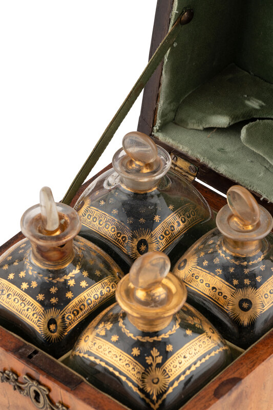 the tantalus opening to a compartmented interior with four gilt-decorated glass decanters, the three tumblers with Victorian silver hallmarks on the silver lip rims.