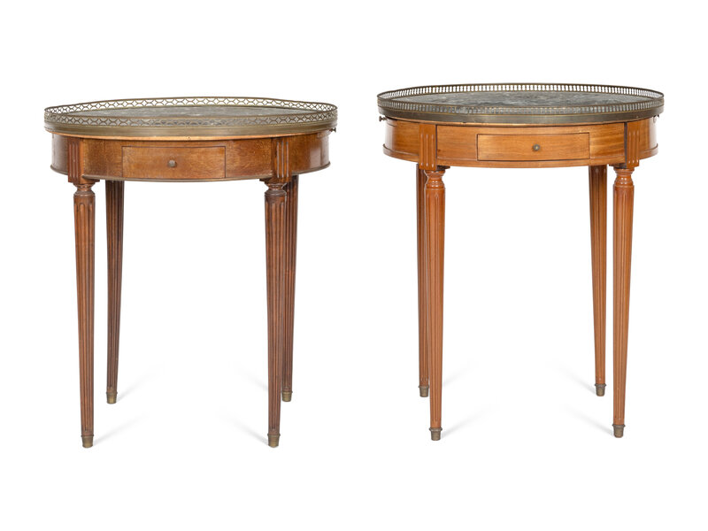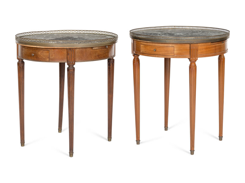 A Near Pair of Louis XVI Style Brass Mounted Mahogany Marble-Top Side Tables