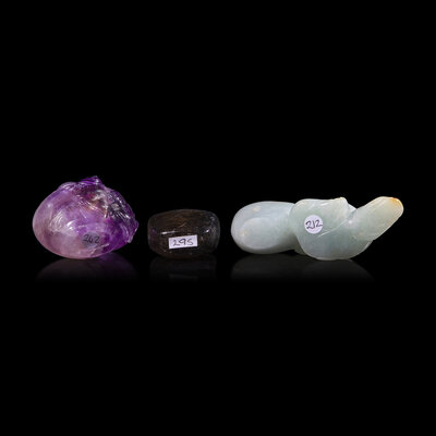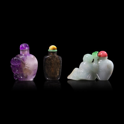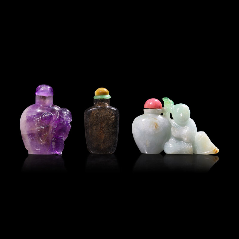 comprising a hair quartz example, glass stopper; a carved apple green and pale green jadeite "Boy, Jar and Bird" example, glass stopper; and a carved amethyst "Shells and Fish" example, hardstone stopper.