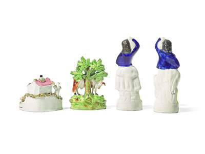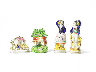 comprising a pair of figures depicting a sailor and lass, and two bocage groups, including a cow with dog and a cottage with shepherd and sheep.