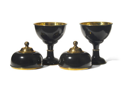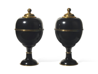 A Pair of Large Black Enameled and Brass Lidded Urns