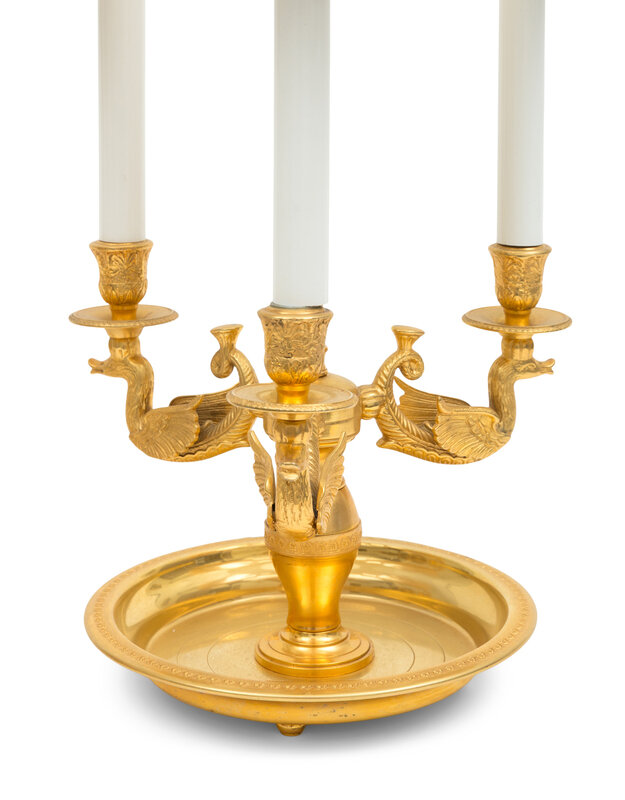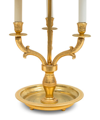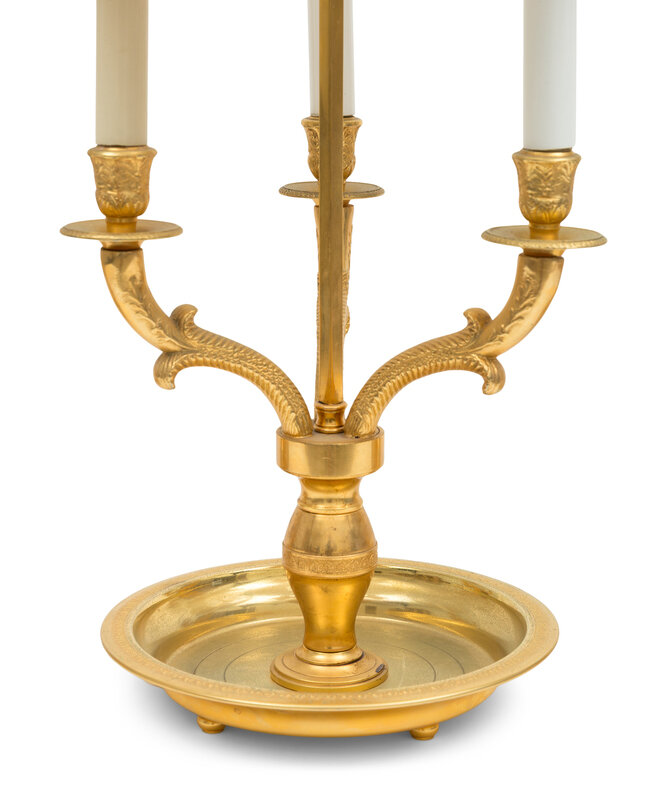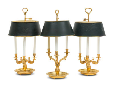 A Trio of French Empire Style Gilt Bronze Bouillotte Lamps with Tole Painted Shades