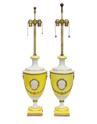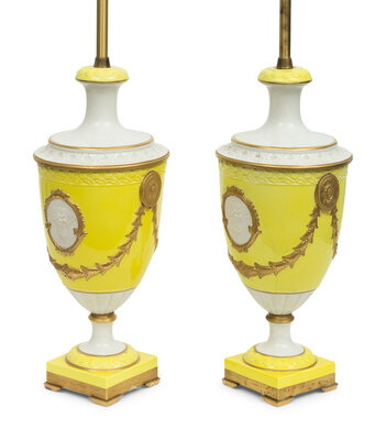 A Pair of Marbro Parcel Gilt Canary Yellow Urn-Form Porcelain Lamps