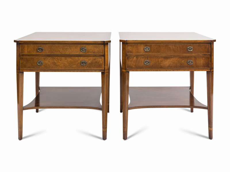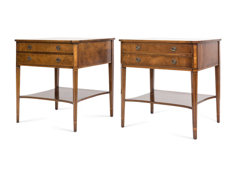 A Pair of Regency Style String Inlaid Mottled Mahogany Two-Drawer Stands