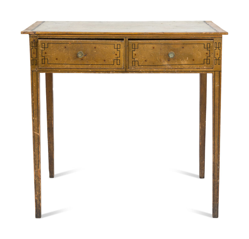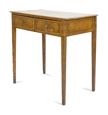 having a faux-marble painted top and banded in a neoclassical Greek key motif.
