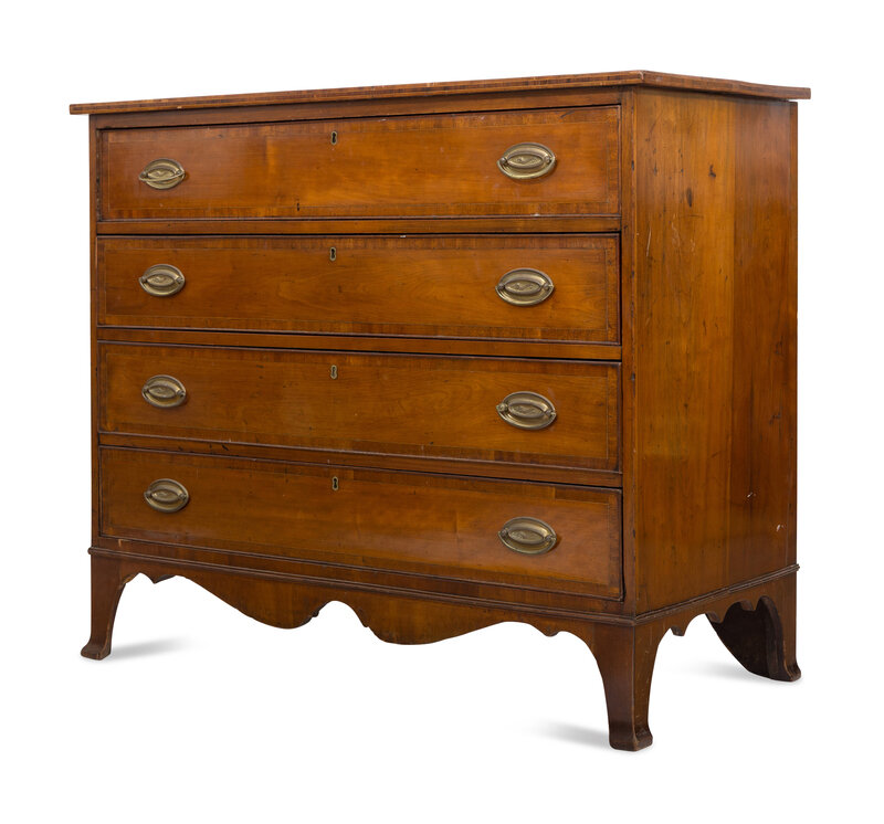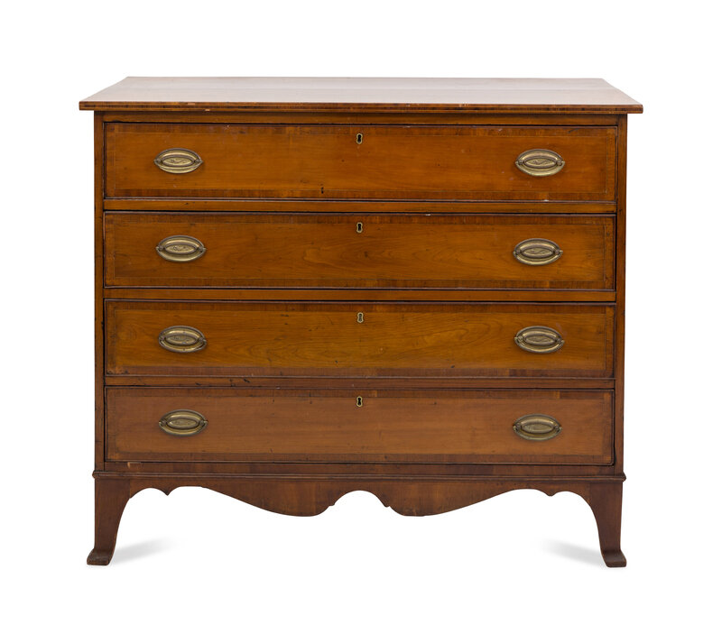 Having four banded drawers; the brass pulls cast with cornucopia of fruit.