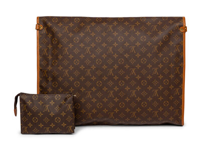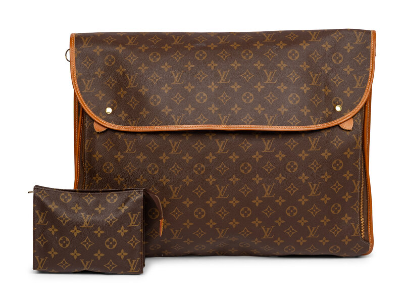 Luggage pouch in monogram coated canvas with leather trim. Snap closures to flap and two zipper closures at sides.
