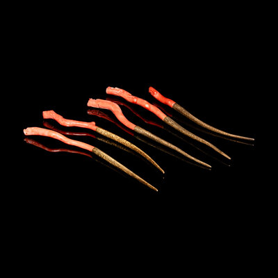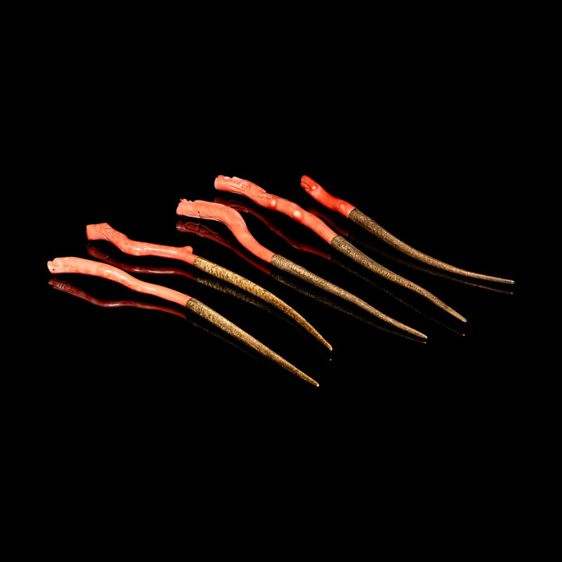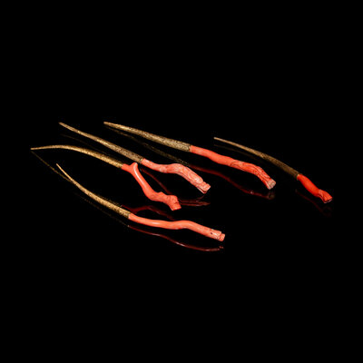 Five Red Coral Mounted 24K Gilt Hairpins, Zan, 20th Century