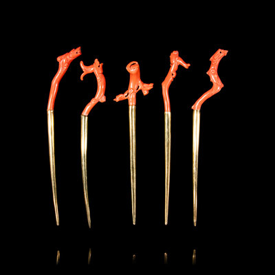 Five Red Coral Mounted 24K Gilt Hairpins, Zan, 20th Century
