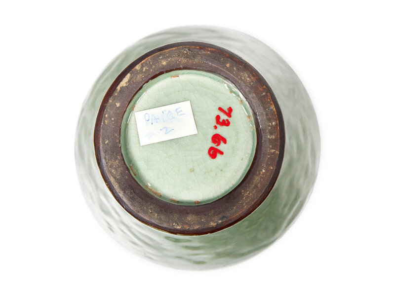 The sturdily potted vase carved with lotus scrolls, underside with red enamel accession number 73.66.