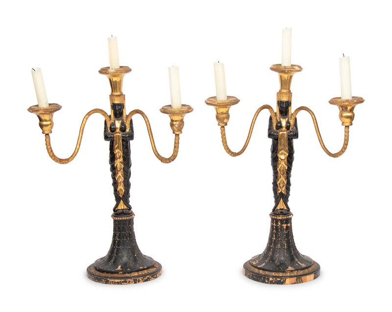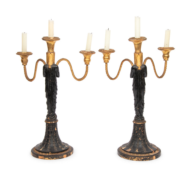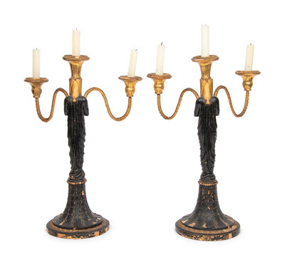 A Pair of Empire Style Painted and Parcel Gilt Candelabra