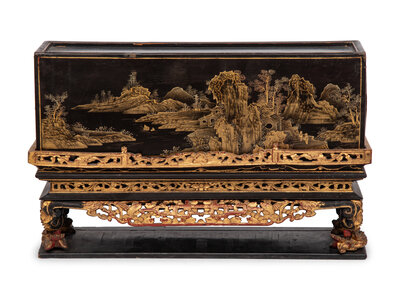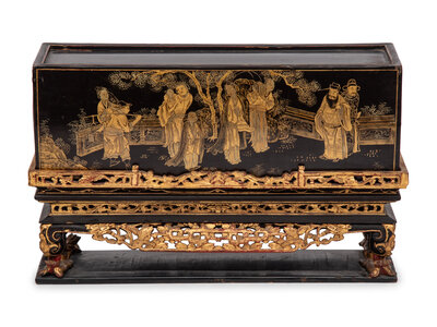 A Chinese Export Lacquer Box or Cache Pot on Associated Stand