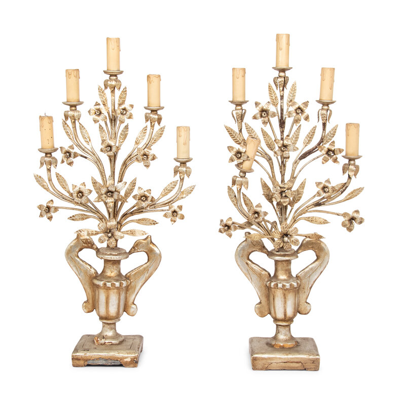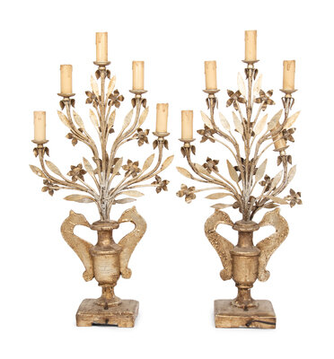 A Pair of Italian Silvered Wood and Tole Five-Light Candelabra
