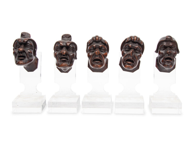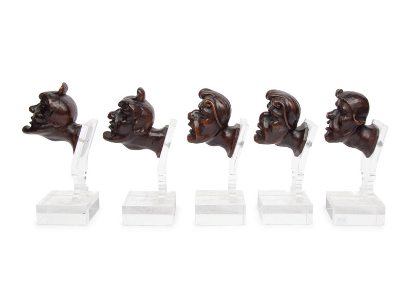 A Set of Five Italian Baroque Carved Walnut Heads of Grotesques