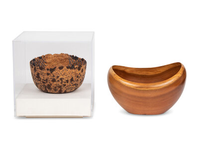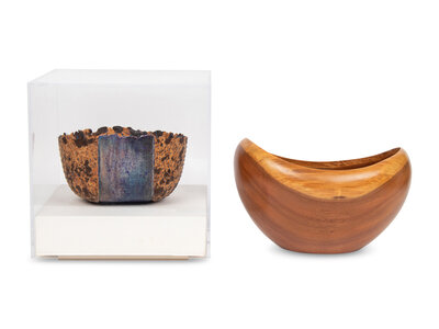 lot includes a turned wood (black walnut) bowl by Peter M. Petrochko (1987). Lot also includes a Sylvia Serenty craft bowl titled Portrait in Blue, constructed of handmade paper, oil pastel, cotton thread, wax and paint. Housed in a plexiglass display case.
