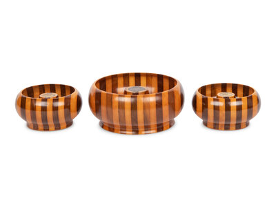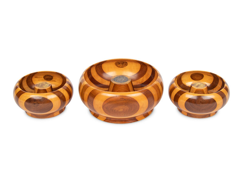 the larger bowl with a silver peace one dollar coin and the two smaller bowls each with a walking liberty fifty cent coin.