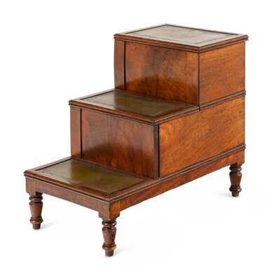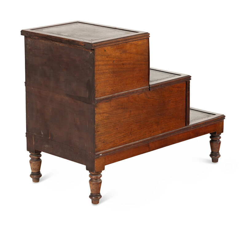 having leather-inset steps, the top step lifting to a vacant compartment, the median step drawing forward and opening to a vacant compartment.