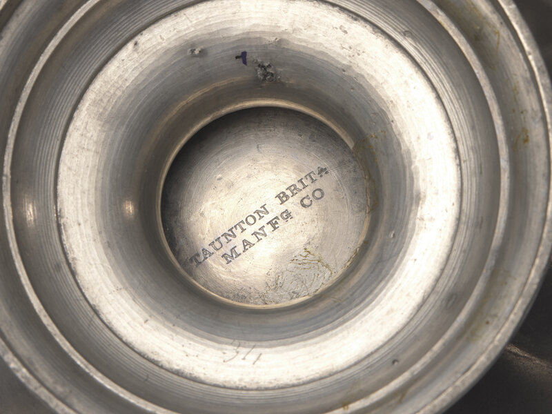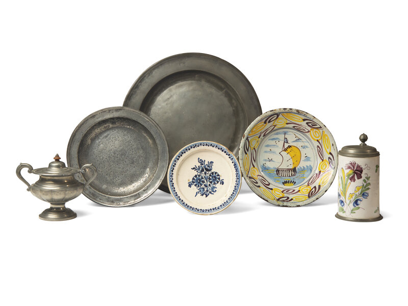 comprising a pewter-mounted polychrome Delft tankard, lid engraved to "J.F.L.," and faintly dated "1832"; a small Delft plate with blue floral motifs, possibly 16th/17th century; a plate with ship in manganese, yellow, and blue hues, Friesland, 17th century; a large pewter charger, by Allen Bright (active 1742-1763), Bristol, with London touch marks, initialed to rim, "I M," Marked; a pewter basin, by Samuel Ellis, London, circa 1740, marked; and a pewter covered sugar bowl, by Taunton Britannia Mfg. Co., Taunton, Massachusetts, circa 1830-1835.