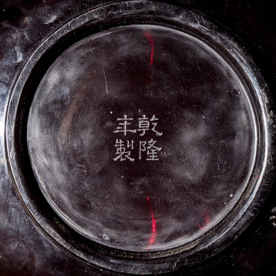 The center is carved in relief with a double-layered lotus, a wheel-cut apocryphal 'Qianlong nian zhi' sealmark on the base.