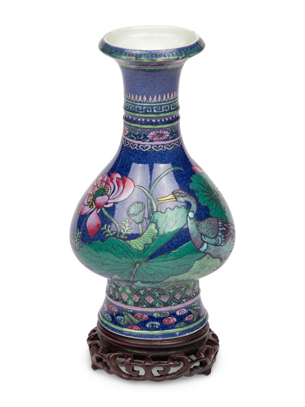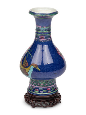 A Chinese Blue Ground Famille Rose Vase with Stand