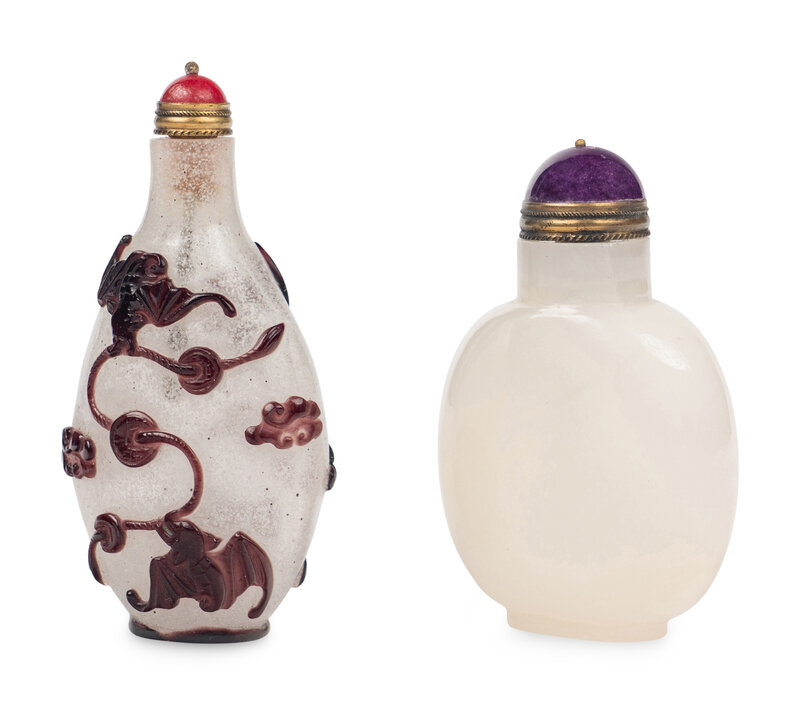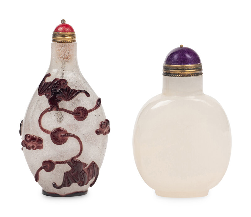 comprising a white jade example and a red overlay glass example, each with a box for storage.