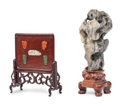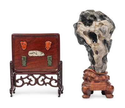 Comprising a Taihu scholar's rock, a jade and agate inset small table screen.
