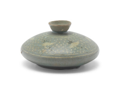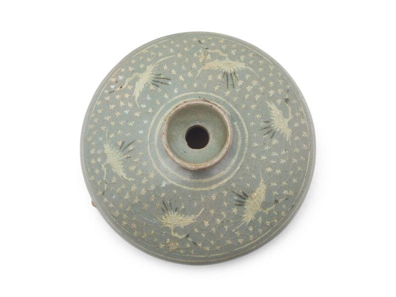 Of typical compressed globular form with cupped mouth, inlaid with flying cranes and florets.