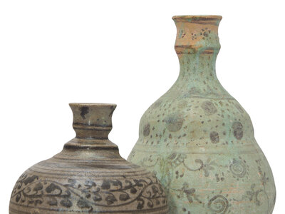 Together with a similar double-gourd bottle vase of buff earthenware with iron brown decoration, matt copper-green tinged glaze.