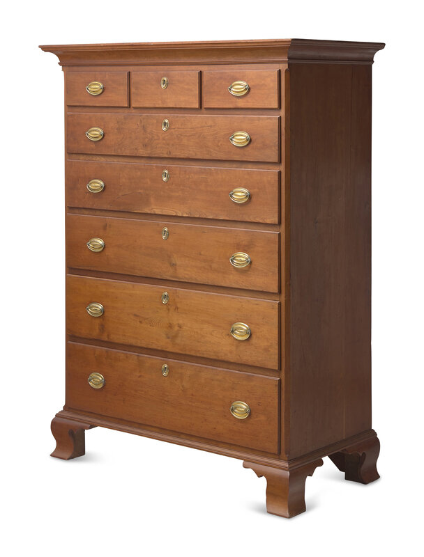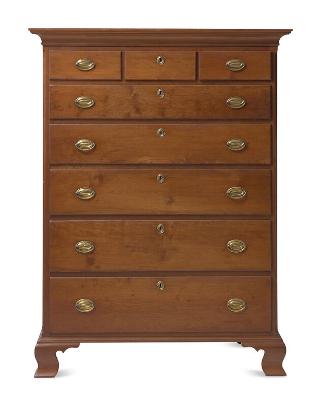 with molded top, over three short drawers, above five graduated long drawers, on molded base with ogee feet.