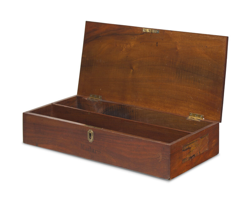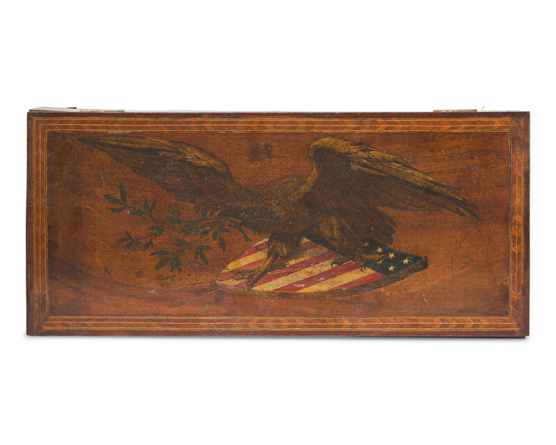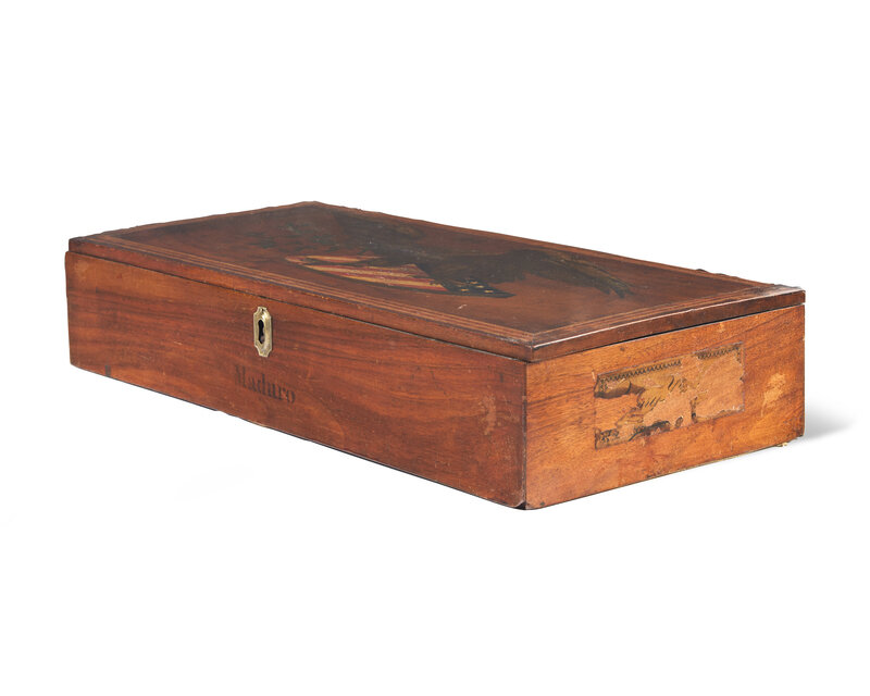 the lid with colored decal in the form of a patriotic eagle with American shield, the front stenciled, "Maduro," and the sides with original remnants of retailer labels, bearing accession number, "80.38."