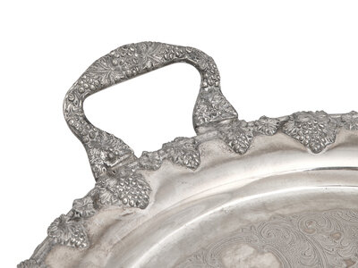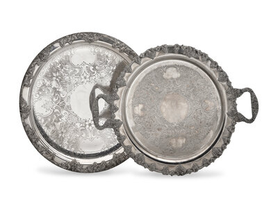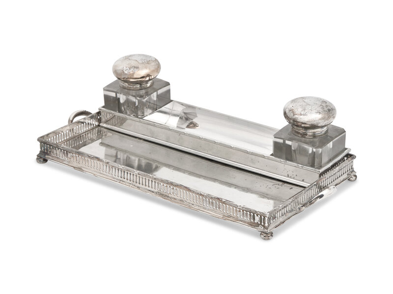 comprising two trays, each bearing accession number to undersides, "89.11," both marked, including one by Federal Silver Co.; and an inkstand with removable tray and two cut glass bottles with silver-plated lids, marked to underside, bearing accession number to underside, "1984.38".