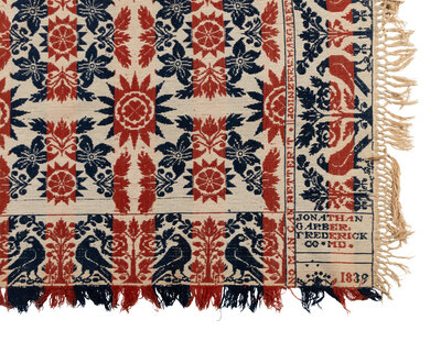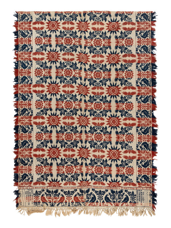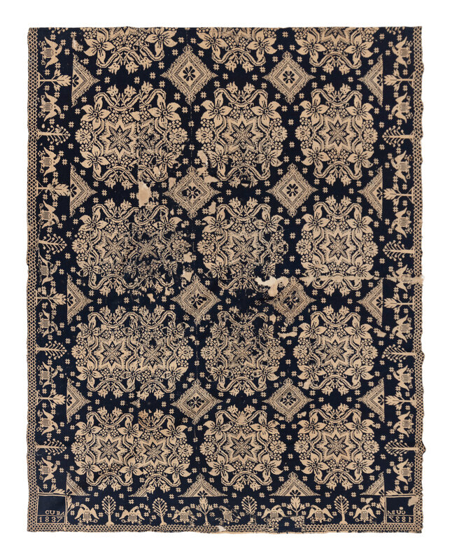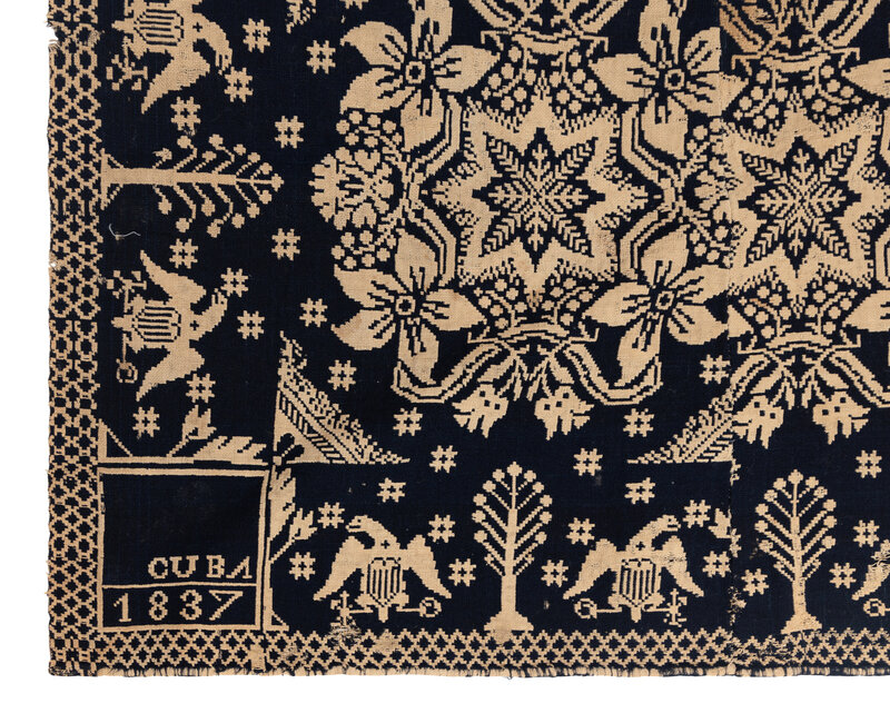 Example 2: natural cotton and blue wool, inscribed Cuba 1837. Cuba, Allegheny County, New York. 78 1/2 × 65 1/2 inches.
