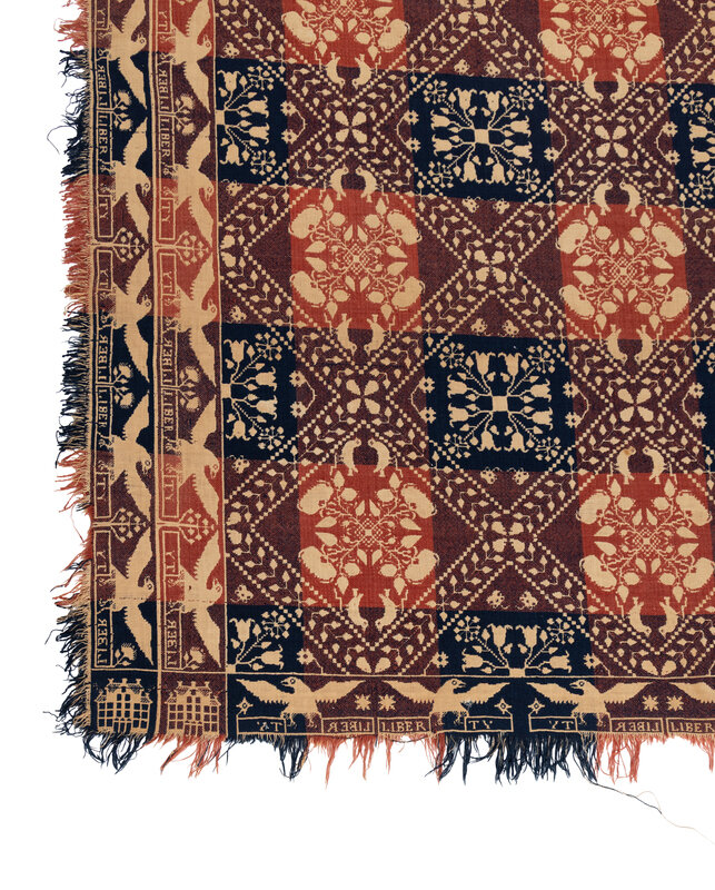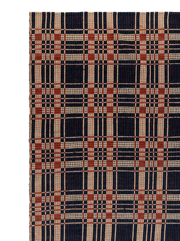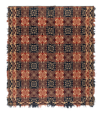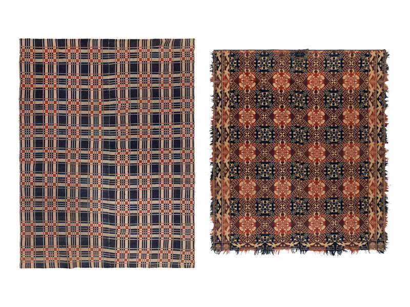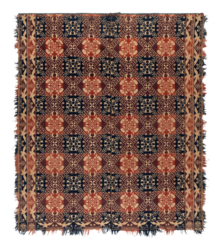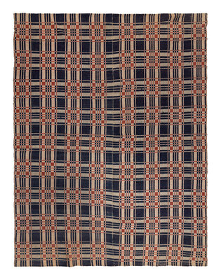 Example 2: cotton with natural blue and red wool. Circa 1820-1825. 83 1/2 × 66 1/2 inches.