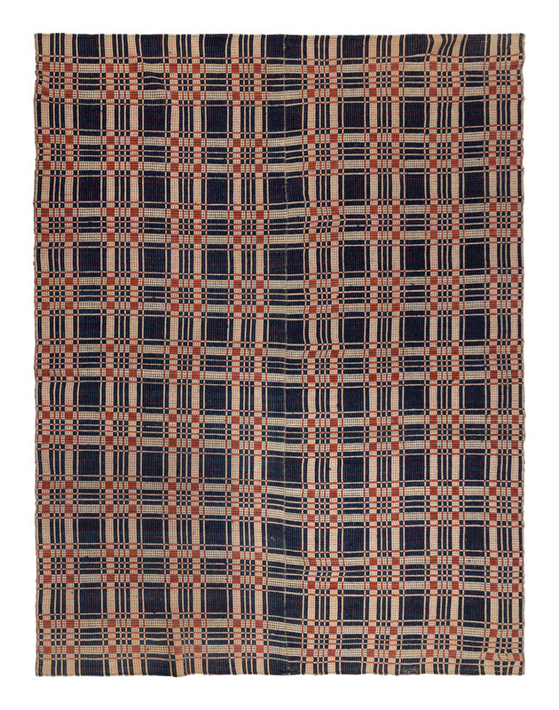 Example 1: cotton with natural blue and red wool. Circa 1825-1840. 88 3/4 × 81 1/2 inches.