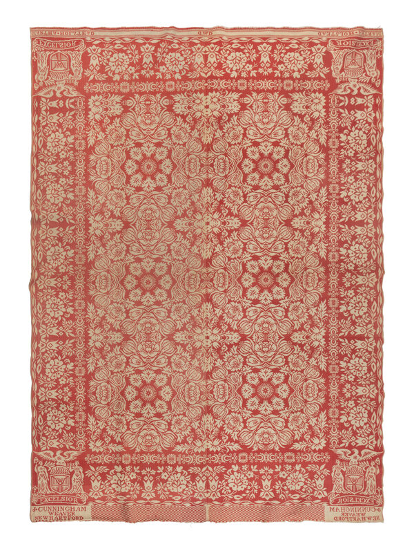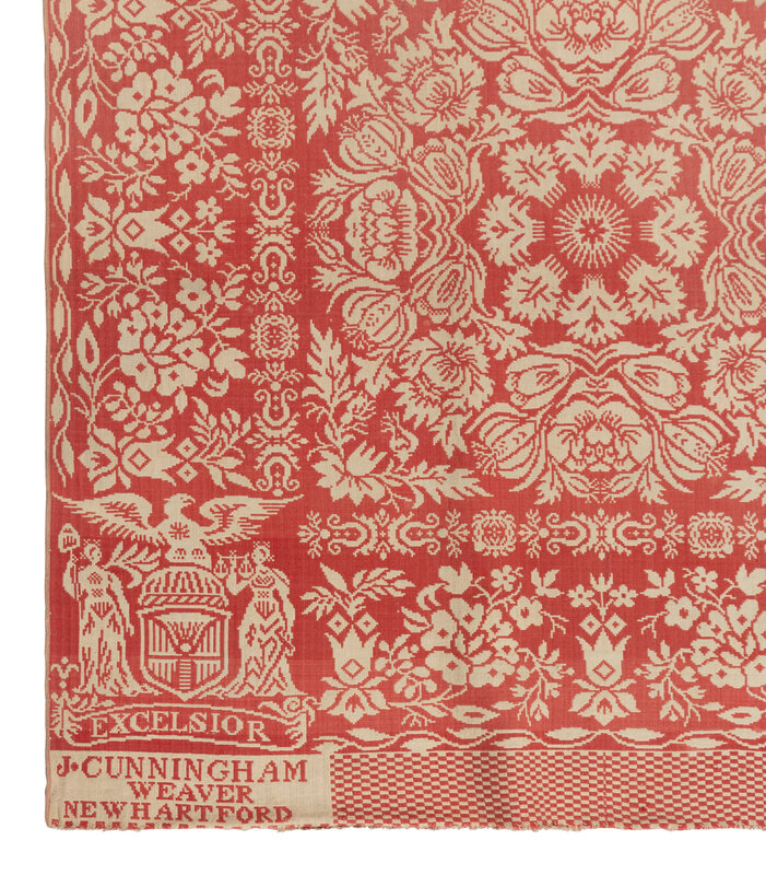 cotton and natural red wool. Inscribed Excelsior J Cunningham weaver New Hartford . Circa 1840-1845. New York, New Hartford Oneida County. 95 × 71 1/4 inches.