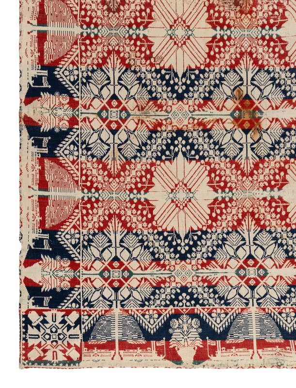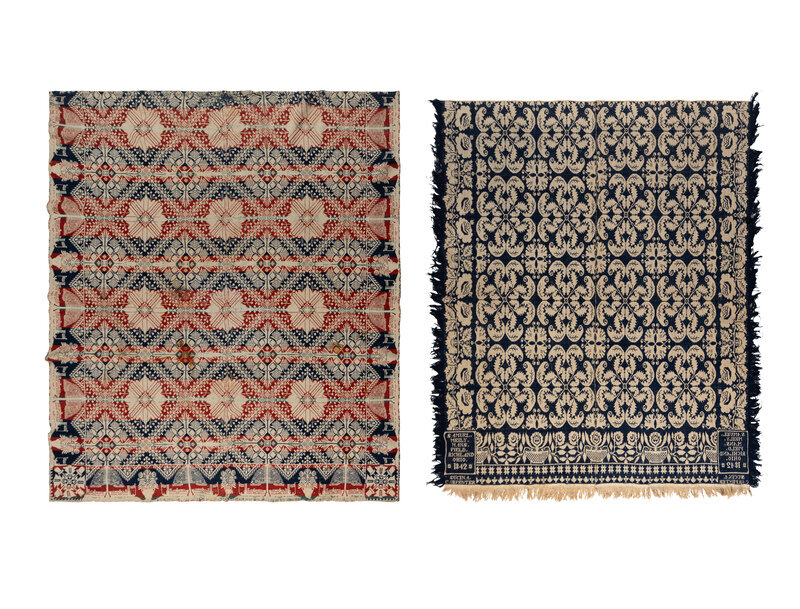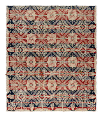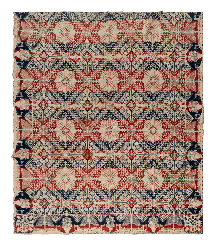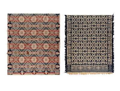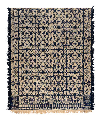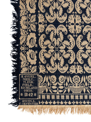 Example 1: natural cotton and blue wool. Inscribed Samuel Meily Mansfield Richland Ohio 1842 Lucina Carpenter. 89 3/4 × 80 1/4 inches.
