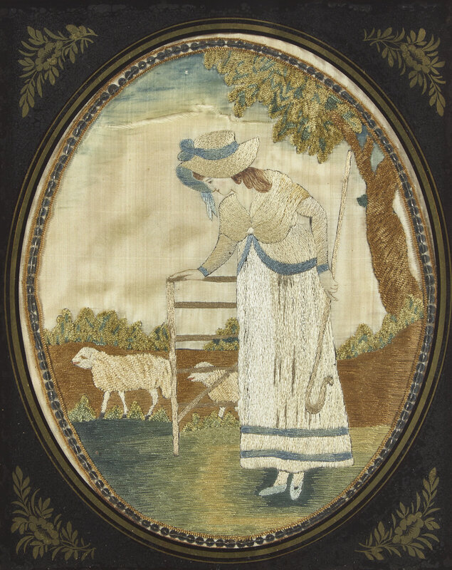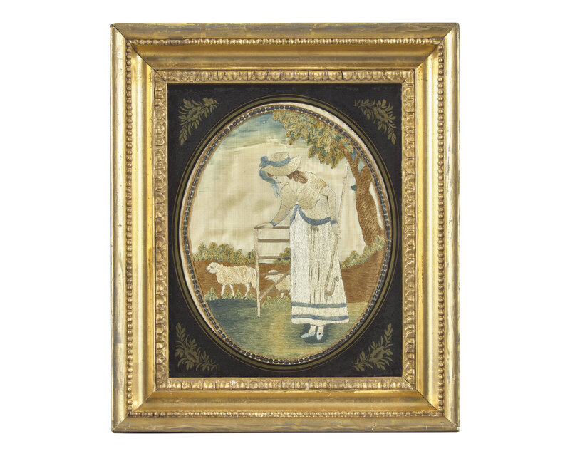 A George III Needlework Picture Depicting a Shepherdess with Sheep