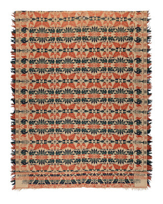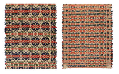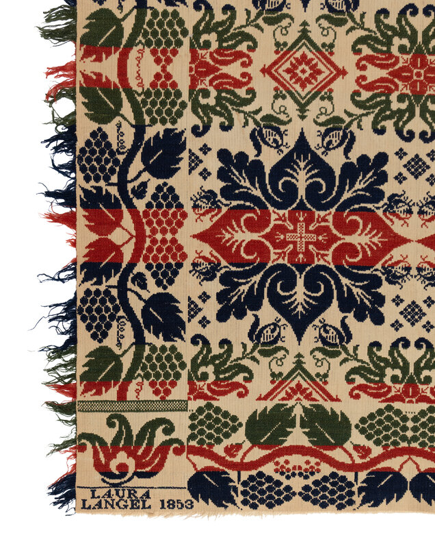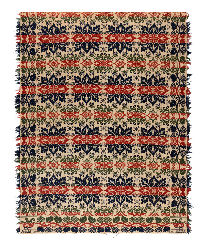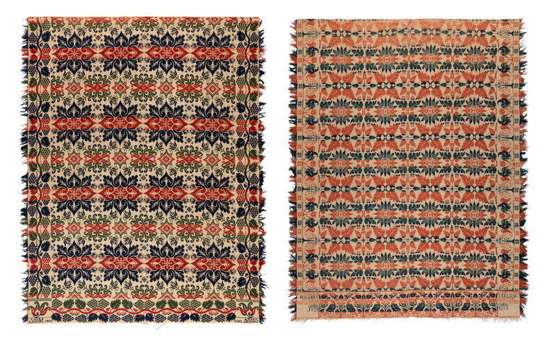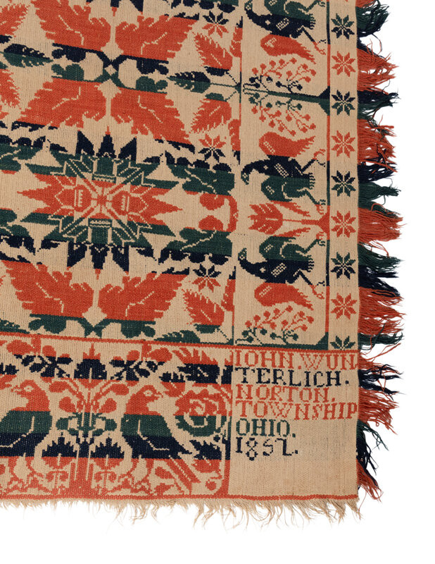 Example 1: natural cotton and red and blue wool. Inscribed John Wunterlich Norton Township Ohio 1857. 101 7/8 × 76 1/4 inches.