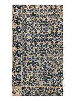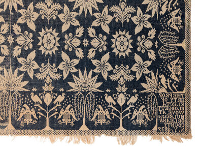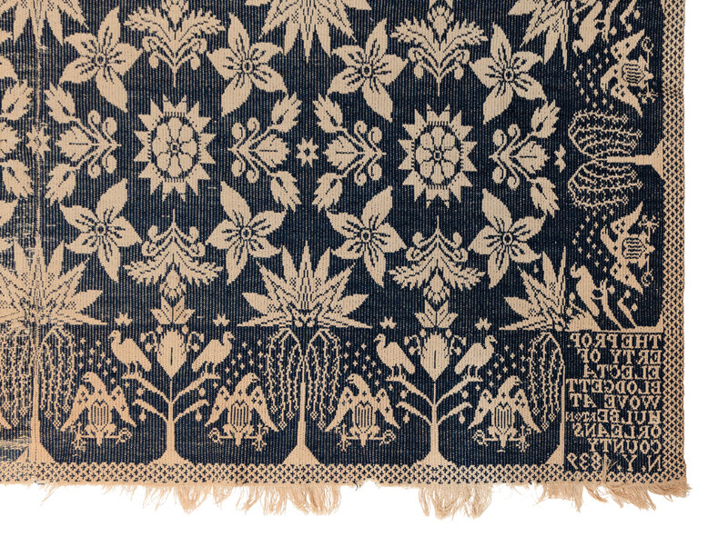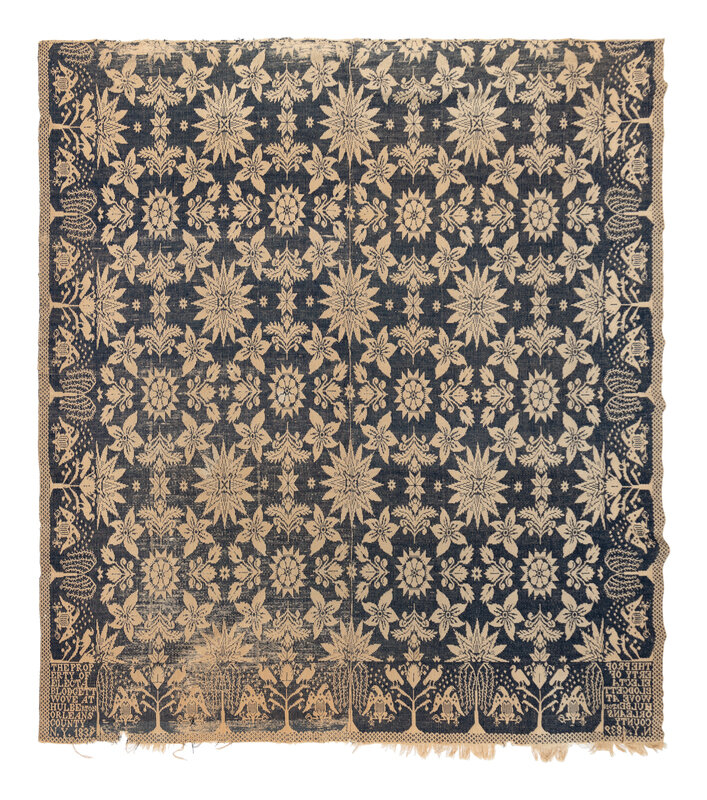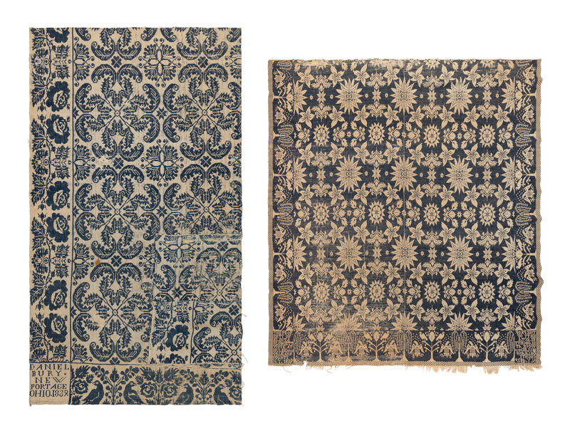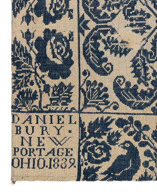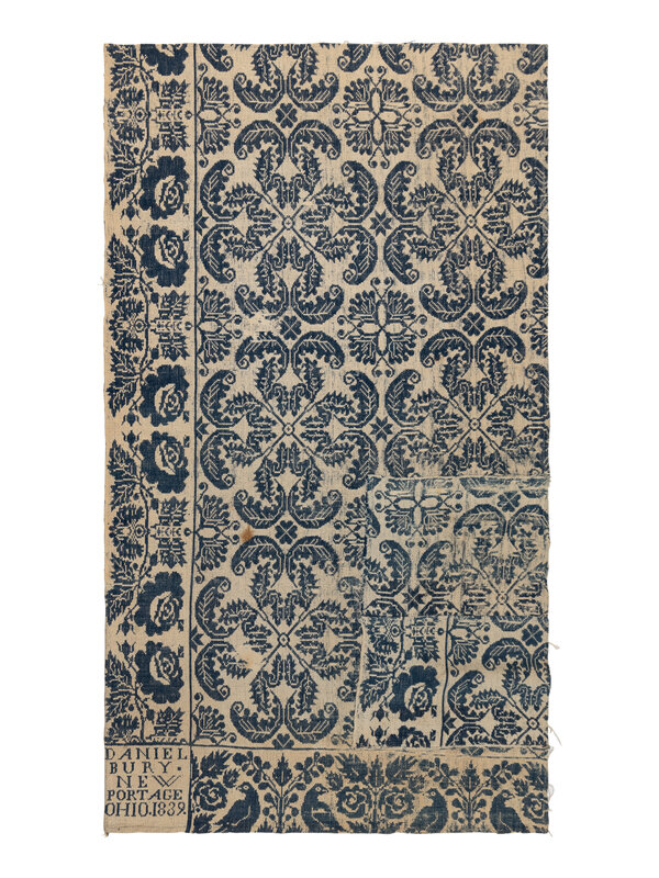 Example 1: natural cotton and light blue wool. Inscribed Daniel Bury New Portage Ohio 1839. 60 x 35 5/8 inches.