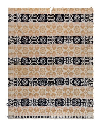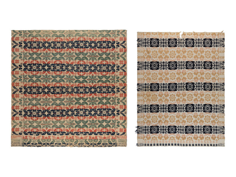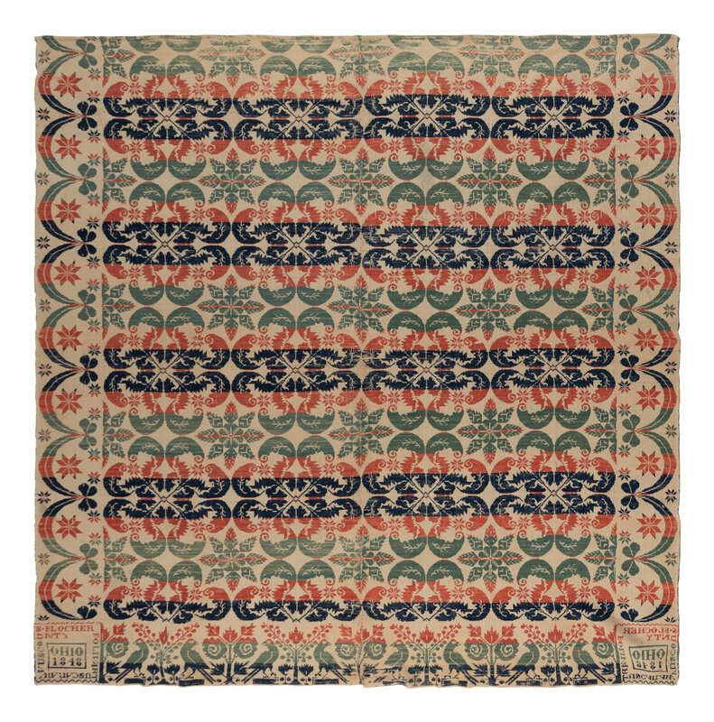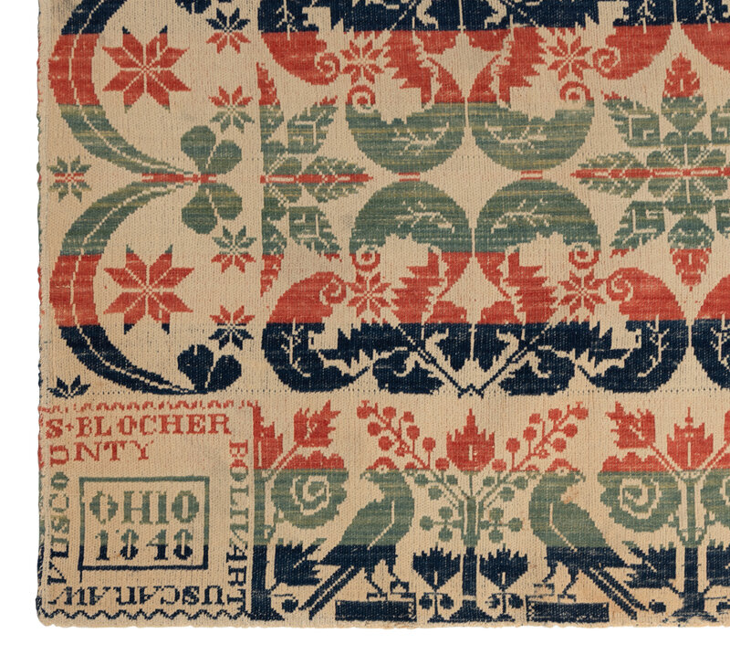 Example 1: natural cotton and blue, red and green wool. Inscribed S Blocher Bolivar Tuscanawus County Ohio 1848. 73 × 66 inches.
